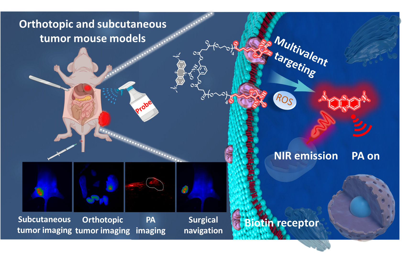 针对上述问题,刘飞扬博士联合东华大学团队,对临床染料MB进行结构优化,成功构建了一种生物素介导的可激活型肿瘤成像探针。该探针通过增强的配体-受体相互作用,显著提升了对肿瘤的靶向识别能力与成像灵敏度,在小鼠异种移植皮下瘤和肝脏原位肿瘤模型中,展现出优异的肿瘤选择性,尤其在识别微小肿瘤(直径约3 mm)方面表现突出。此外,该探针在荧光手术导航中能够准确描绘肿瘤边界,有效辅助肿瘤组织的完整切除,显著降低术后复发风险。该成果有望为光学成像引导下的肿瘤精准手术切除提供新型、实用的分子工具。