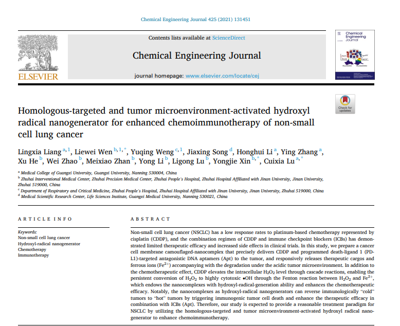 医学院陆翠霞课题组在Chemical Engineering Journal (中科院1区,影响因子13.273)期刊上发表文章